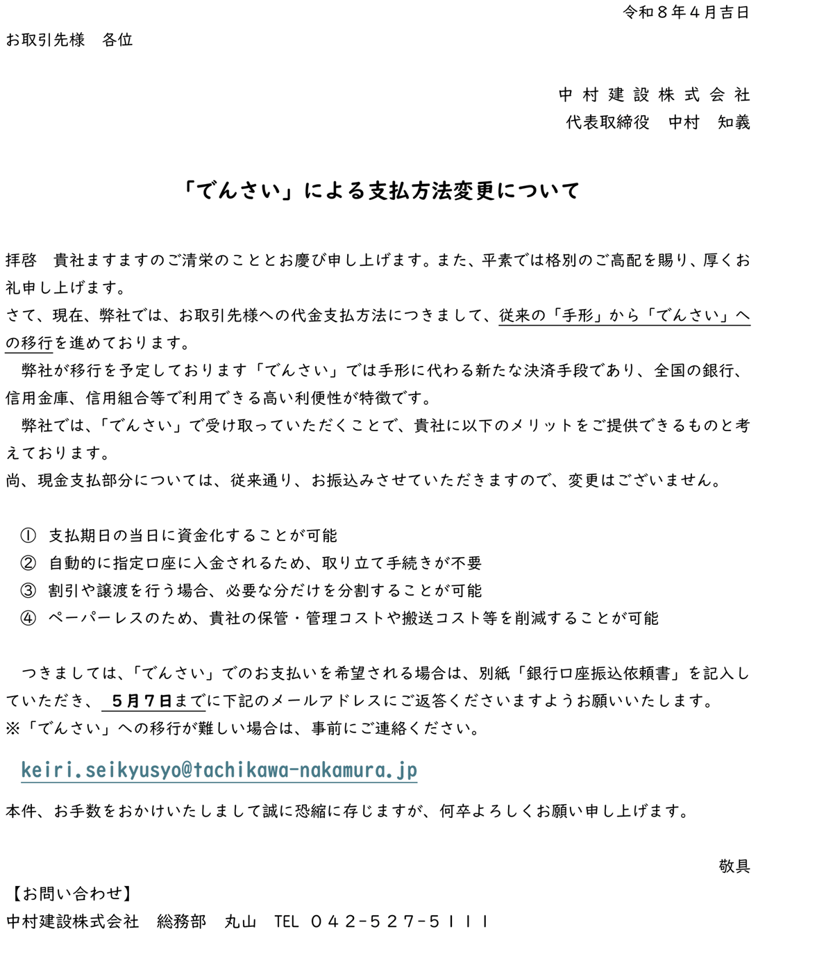 現在、弊社では、お取引先様への代金支払方法につきまして、従来の「手形」から「でんさい」への移行を進めております。